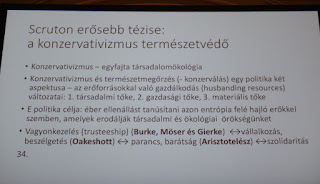 Horkay Hörcher Ferenc, a Pázmány Péter Katolikus Egyetem egyetemi tanára, a Nemzeti Közszolgálati Egyetem Politika- és Államelméleti Kutatóintézetének igazgatója előadásának középpontjába Sir Roger Scruton angol politikai filozófust helyezte, aki véleménye szerint egyike azoknak a konzervatív szerzőknek, aki a kezdetektől fogva komolyan vette a környezetvédelem ügyét, hiszen az szerves részét képezi egy megalapozott kortárs, konzervatív politikai filozófiának. Az előadó olyan főbb témaköröket járt körbe, mint az angol vidék leírása Scrutonnál, illetve a konzervatív érvelés a természet megőrzése (konzerválása) mellett.